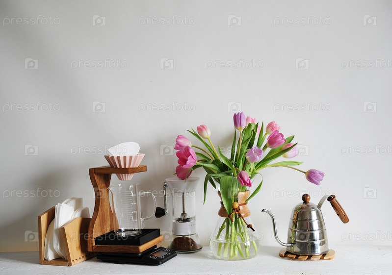 Букет тюльпанов цветов в графине кофе на белом столе. Ручное заваривание с помощью капельницы оригами, бумажный фильтр