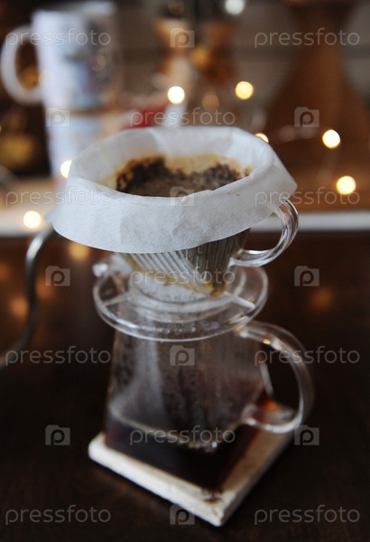 Заваривание кофе с бумажным фильтром. Огни на заднем плане