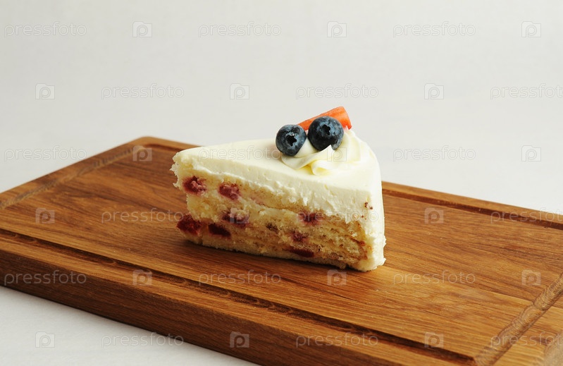 Кусок молочного пирога на деревянной доске. Бисквитные коржи, сливочный крем, ягодный джем, сырная глазурь. Украшен свежими ягодами