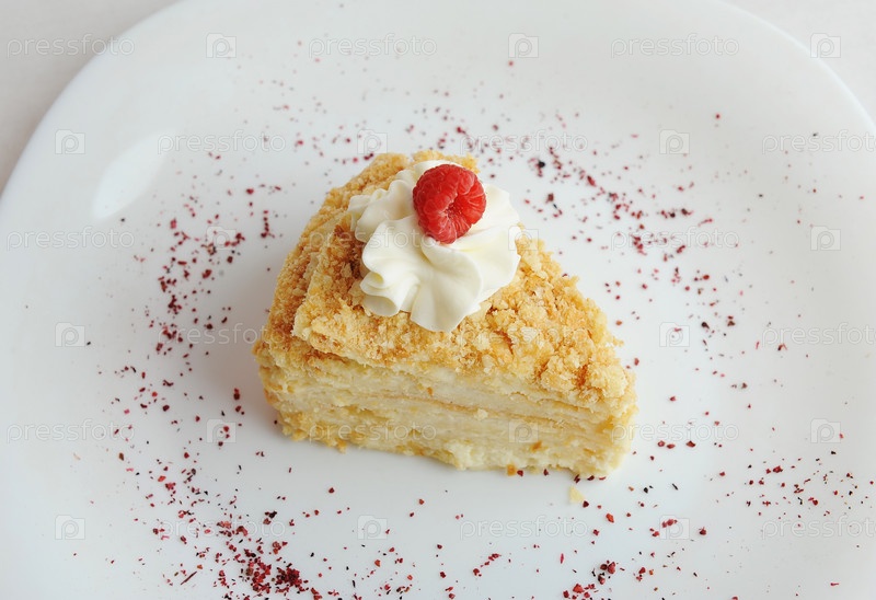 Кусочек классического торта «Наполеон», украшенный кремом и свежей малиной. Белая тарелка, обсыпанная сушеными ягодами