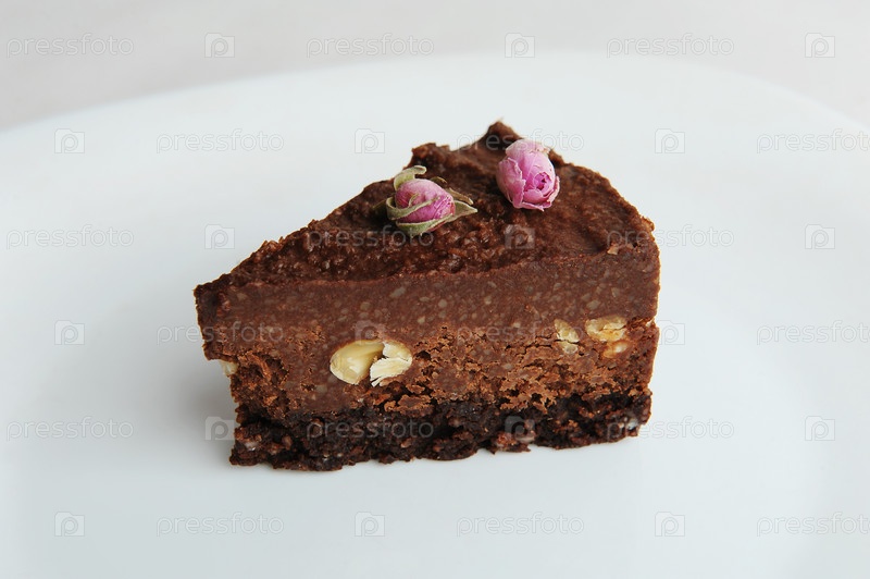 Кусочек веганского шоколадно-орехового торта на белой тарелке крупным планом