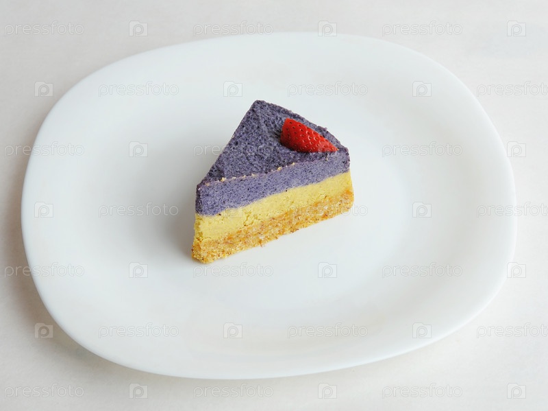 Кусок сырого веганского черничного торта на белом фоне. Украшен свежей клубникой. Вид сверху, пространство для копирования. Концепция здорового питания, десерт без выпечки