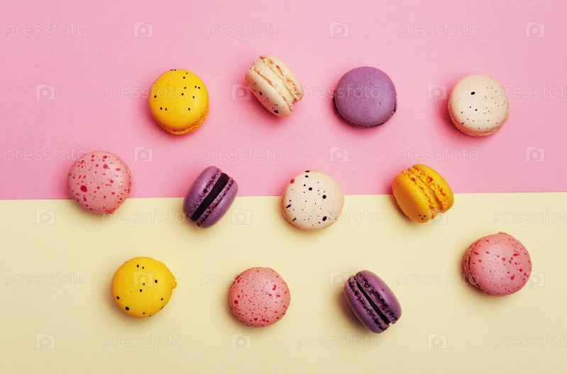 Французский десерт красочные макароны на двухцветном розово-бежевом геометрическом фоне