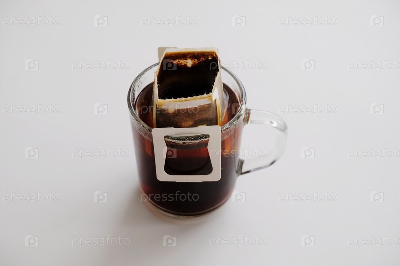 Кофе в капельном мешке на стеклянной чашке. Мгновенный метод свежего заваривания