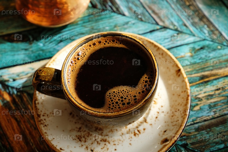 Свежезаваренный горячий турецкий кофе в керамической чашке эспрессо. Вид сверху, крупный план. Медная турка. Бирюзовый деревянный поднос