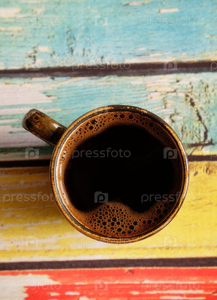 Свежий горячий черный кофе в керамической чашке эспрессо. Вид сверху, крупный план. Фон цветной доски