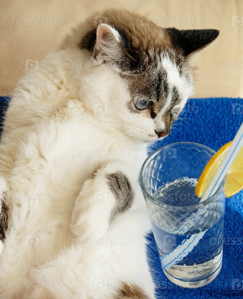 Симпатичная белая голубоглазая кошка отдыхает на песчаном пляже. Синее пляжное полотенце, лимонный коктейль с соломинкой, солнечные ванны