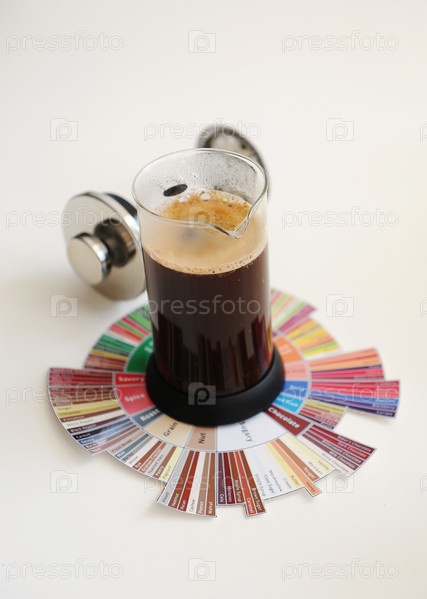 Заваривание черного кофе во френч-прессе. На колесе ароматов дегустатора кофе. белый фон