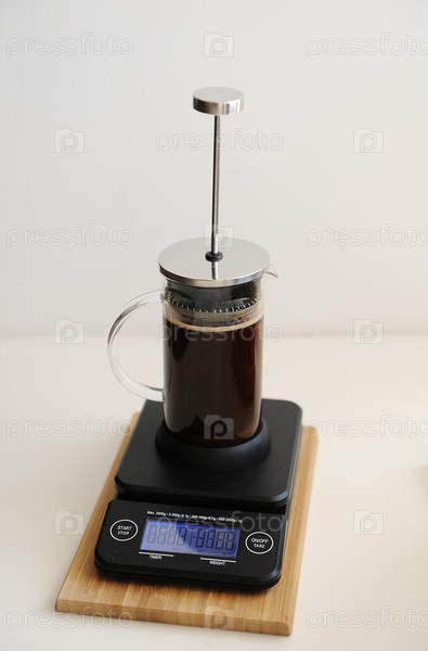 Заваривание кофе во френч-прессе. Плунжер не опущен. На черных электронных весах таймера
