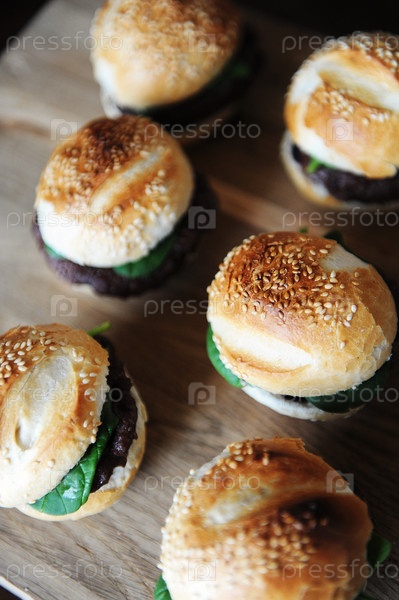 Шесть свежеприготовленных гамбургеров на деревянной доске. Булочка с кунжутом, котлета из говядины, зелень шпината и ягодный соус