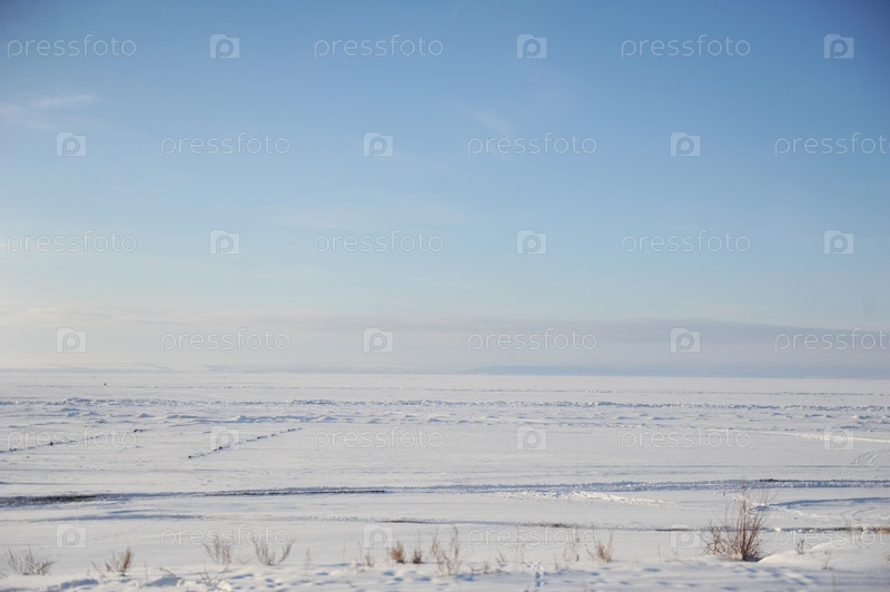 Зимний снежный пейзаж. Бескрайнее пространство замерзшей реки