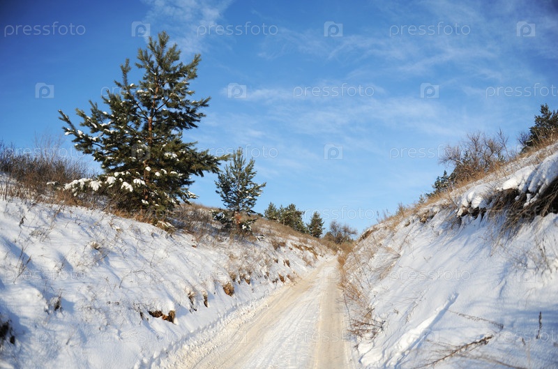 Зимний снежный пейзаж. Глубокая дорога между холмами. Солнечный день