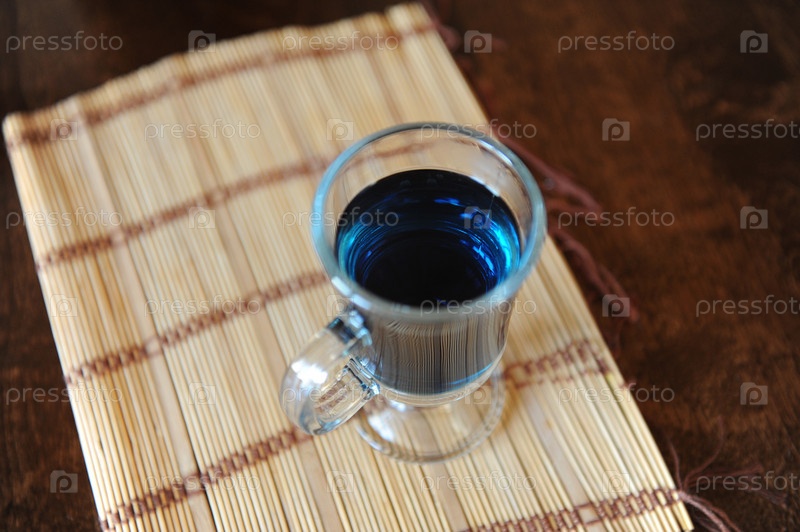 Синий тайский чай анчан в стеклянной чашке на бамбуковой циновке на деревянном столе, вид сверху