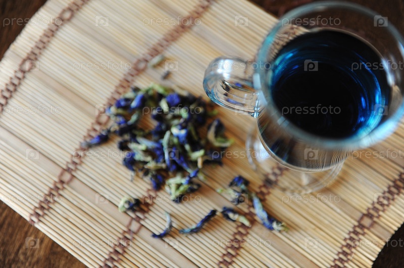 Синий тайский чай анчан в стеклянной чашке на бамбуковой циновке на деревянном столе, вид сверху. Россыпь цветов клитора рядом с чашечкой