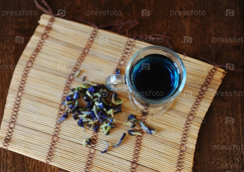 Синий тайский чай анчан в стеклянной чашке на бамбуковой циновке на деревянном столе, вид сверху. Россыпь цветов клитора рядом с чашечкой