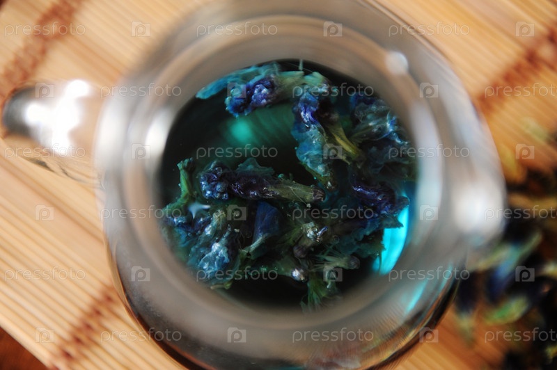 Синий тайский чай анчан заваривают в стеклянной банке. Вид сверху, крупный план