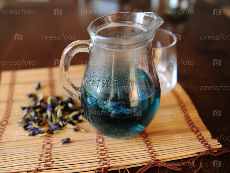 Синий тайский чай анчан в прозрачном стеклянном кувшине на бамбуковой циновке на деревянном столе. Россыпь сухих цветков клитории на чай