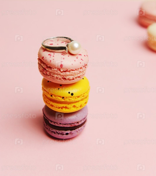 Серебряное кольцо с жемчужиной на вершине красочных макарон, розовый фон. Концепция рекламы ювелирных изделий