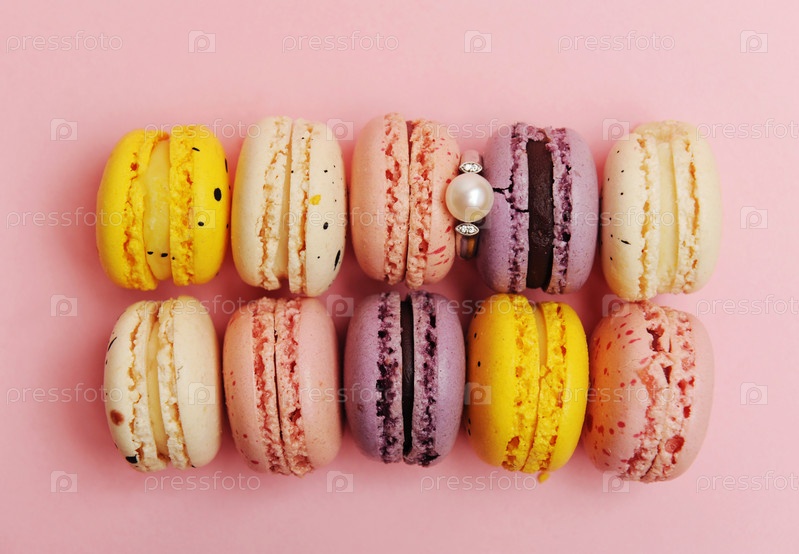 Серебряное кольцо с жемчужным кольцом среди макарон как на подставке. Розовый фон. Концепция рекламы ювелирных изделий