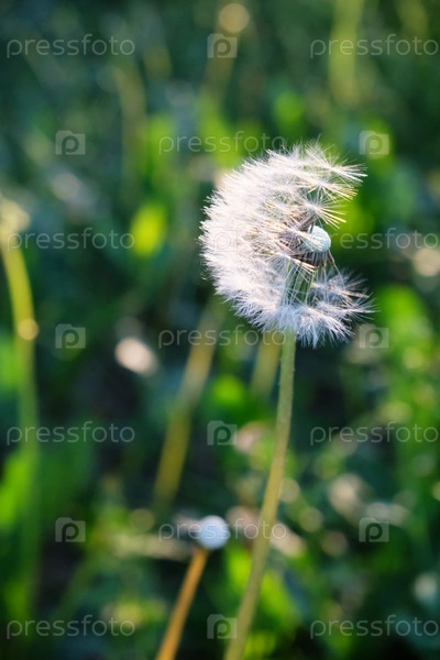 Белые пушистые одуванчики крупным планом в контровом свете заходящего солнца. Красивая летняя природа, парк