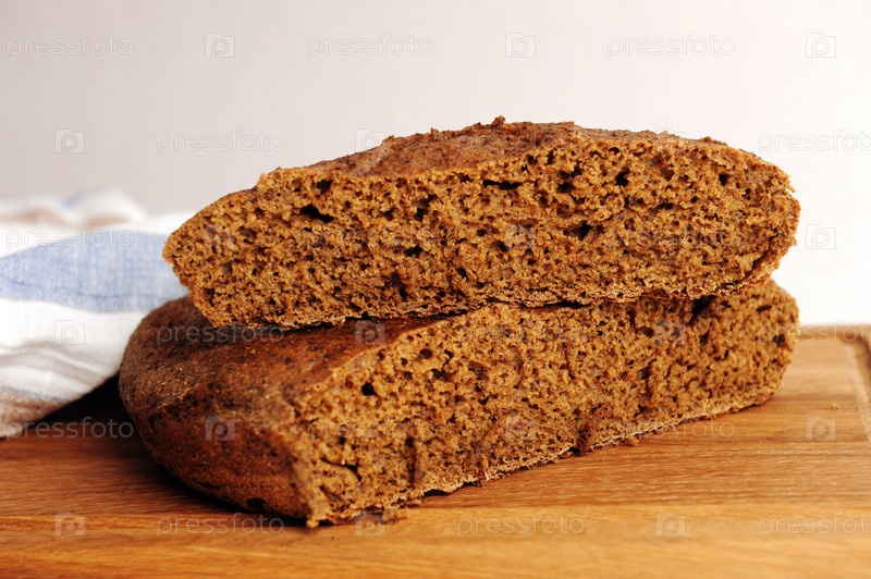 Свежий домашний круглый солодовый ржаной хлеб на деревянной доске, льняная ткань. На белом фоне