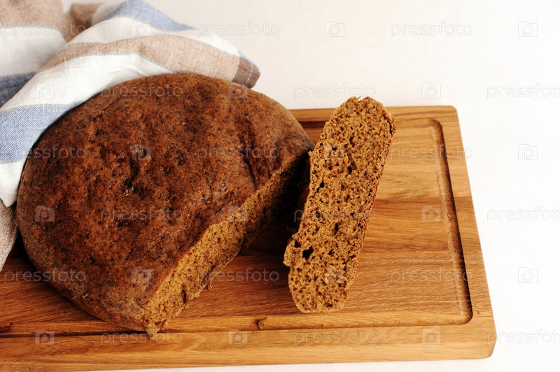 Свежий домашний круглый солодовый ржаной хлеб на деревянной доске, льняная ткань. На белом фоне