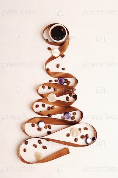 Елочка из атласной ленты, украшенная кофейными зернами и жемчужными шариками. Чашка черного кофе. Новый год