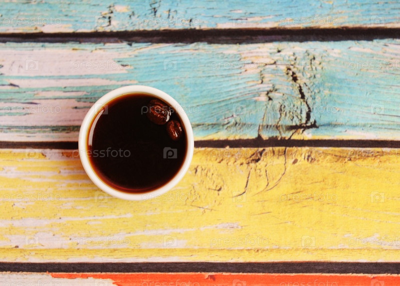 Черный кофе в белой чашке на красочном деревянном столе. Вид сверху, пространство для копирования