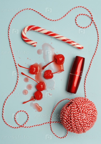 Помада, коктейльная вишня, леденец и белый красный веревочный мяч на голубом фоне. Концепция рождественского подарка