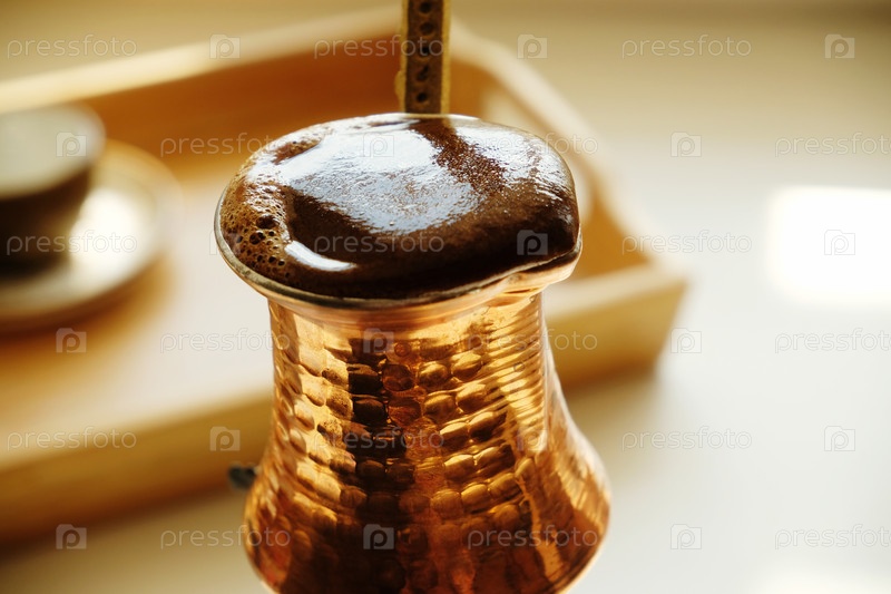 Растущий кофе в медной турке крупным планом. турецкий кофе