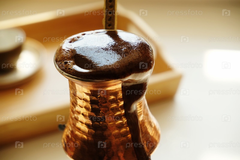 Кипение кофе в медной турке крупным планом. Турецкий кофе, процесс заваривания