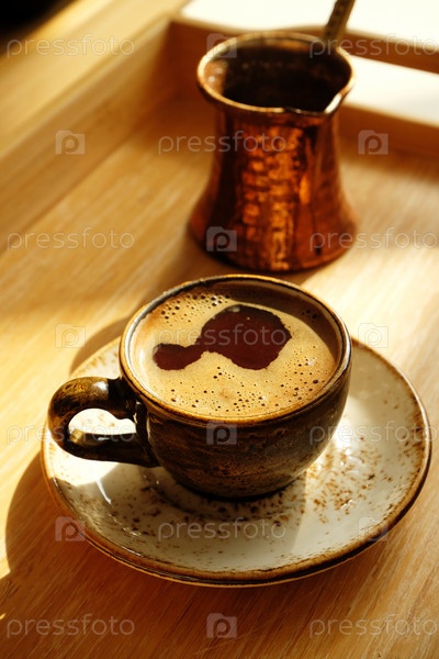 Свежезаваренный горячий турецкий кофе в керамической чашке. Медная турка. Поднос из бамбукового дерева. Дневной свет, тени