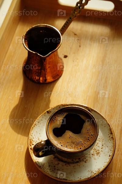Свежезаваренный горячий турецкий кофе в керамической чашке. Медная турка. Поднос из бамбукового дерева. Дневной свет, тени