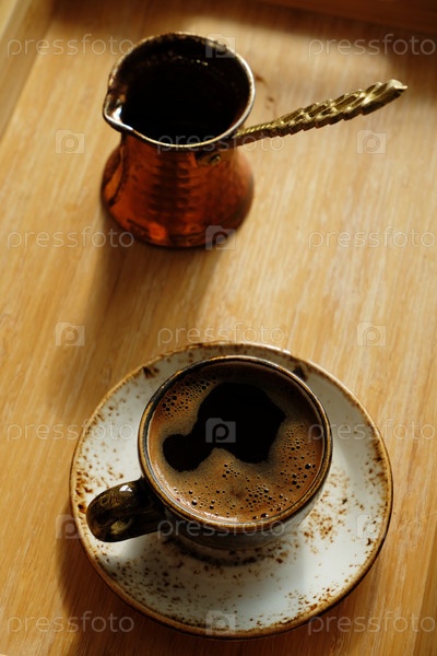 Свежезаваренный горячий турецкий кофе в керамической чашке. Медная турка. Поднос из бамбукового дерева. Дневной свет, тени