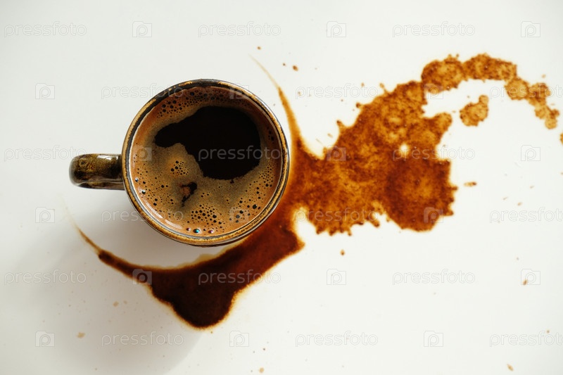 Чашка эспрессо на пролитых кофейных пятнах на белом фоне, вид сверху