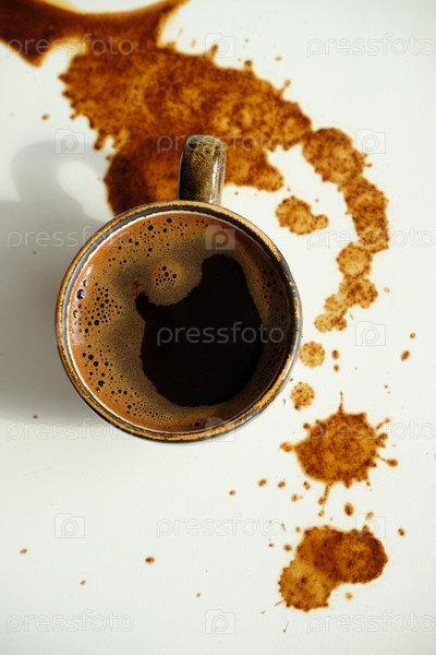 Чашка эспрессо на пролитых пятнах кофе на белом фоне вид сверху