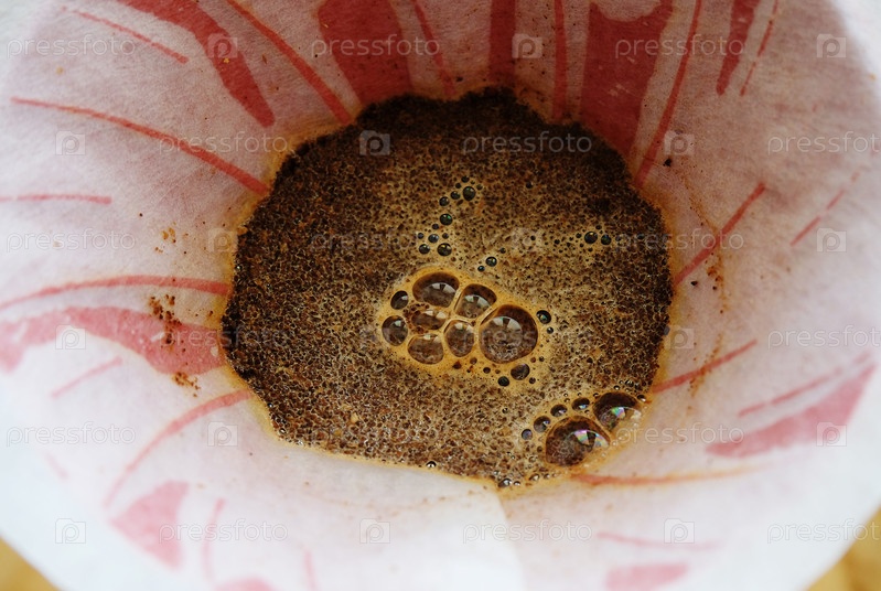 Кофе цветет в бумажном фильтре в капельнице, крупный план. Заливной способ заваривания
