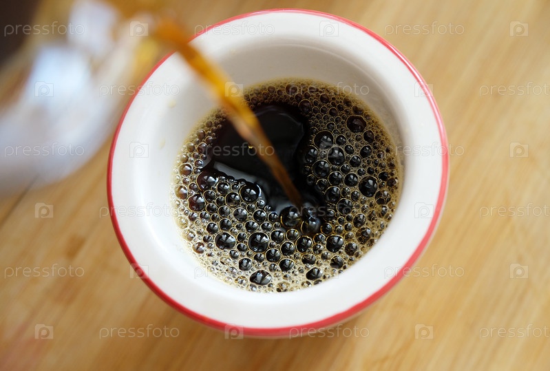 Наливание свежесваренного черного кофе на фильтрованный кофе в чашку крупным планом