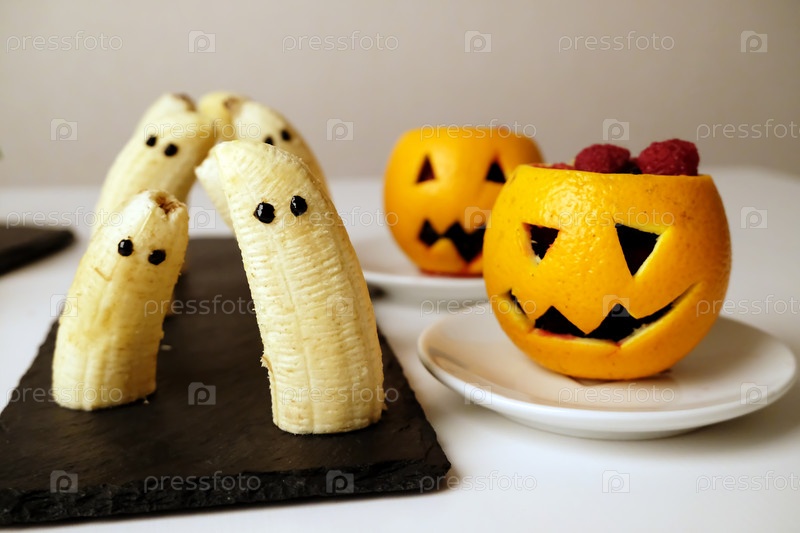 Здоровые фруктовые угощения на Хэллоуин. Банановые призраки, оранжевые тыквенные валеты