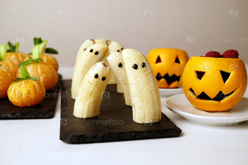 Здоровые фруктовые угощения на Хэллоуин. Банановые призраки, мандарины, фальшивые тыквы, апельсиновые тыквенные джеки