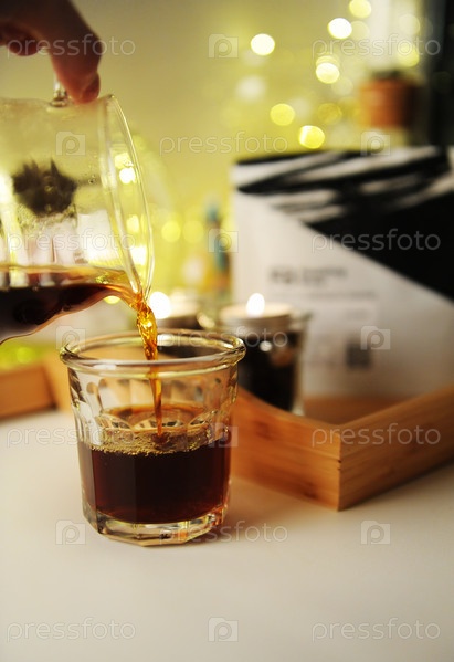 Наливание черного фильтрованного кофе в стекло в рождественском интерьере
