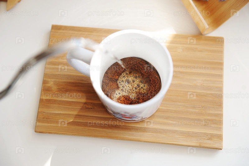 Заваривание кофе в кружке. Выливание воды из чайника на гусиной шее в чашку со свежемолотым кофе, вид сверху