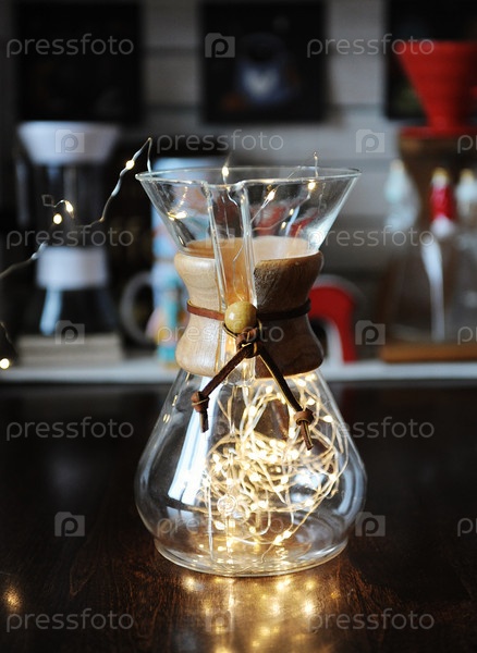 Светящаяся гирлянда внутри кемекса для заваривания кофе. Аллегорическое творческое искусство визуализации яркого вкуса