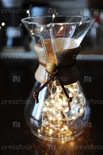 Светящаяся гирлянда внутри кемекса для заваривания кофе. Аллегорическое творческое искусство визуализации яркого вкуса
