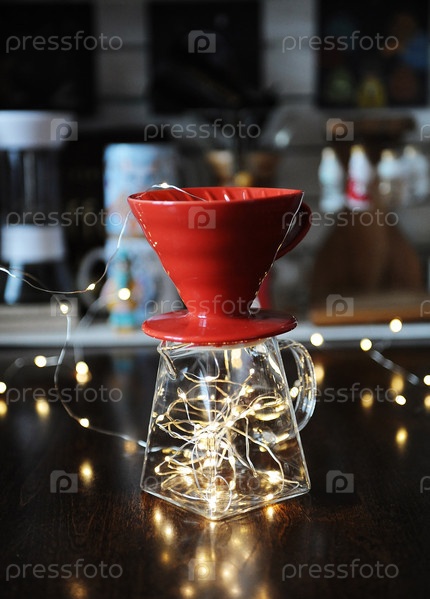Светящаяся гирлянда внутри кувшина с капельницей v60 для заваривания кофе. аллегорическое творческое искусство визуализации яркого вкуса