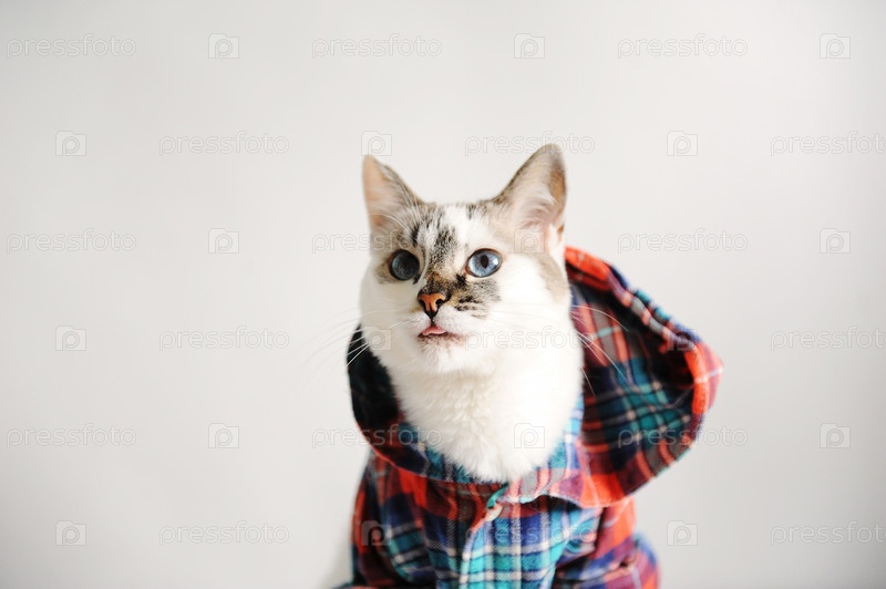 Белый пушистый голубоглазый кот в клетчатой рубашке с капюшоном на светлом фоне. Портрет крупным планом