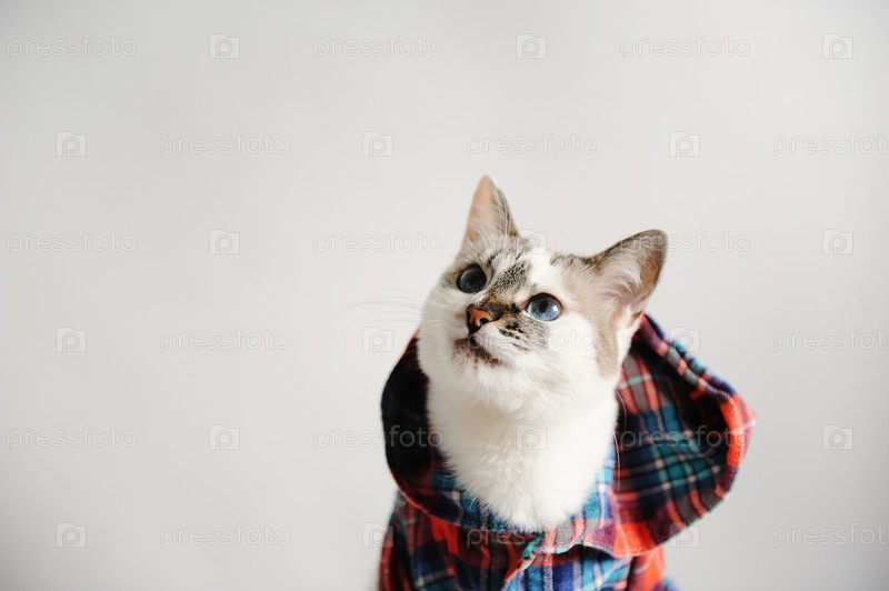 Белый пушистый голубоглазый кот в клетчатой рубашке с капюшоном на светлом фоне. Портрет крупным планом. Свободное пространство для дизайна