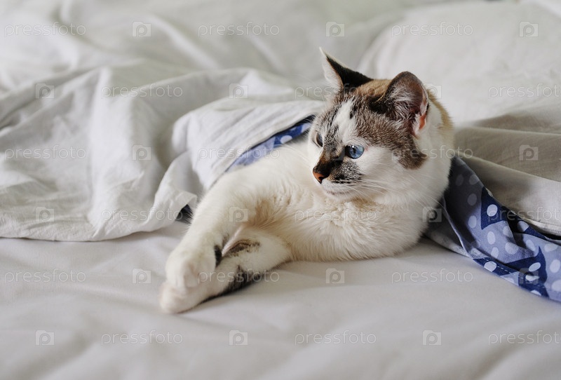 Белый пушистый голубоглазый кот лежит в постели, покрытый одеялом