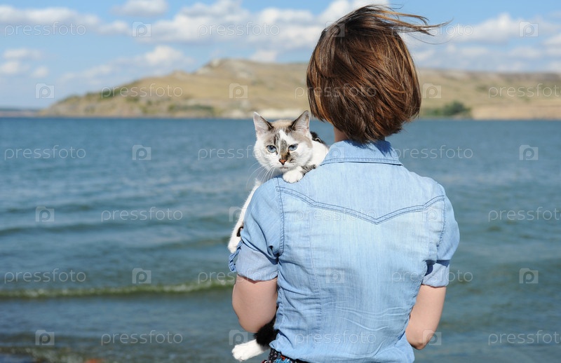 Прогулка по морю с домашним питомцем. Девушка держит белого кота. Фон моря и острова в солнечный день