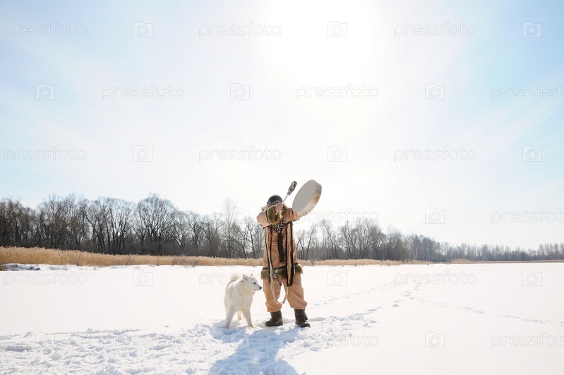 Северный шаман бьет в бубен, совершая обряд призыва весны. Хаски собаки. Зимний пейзаж